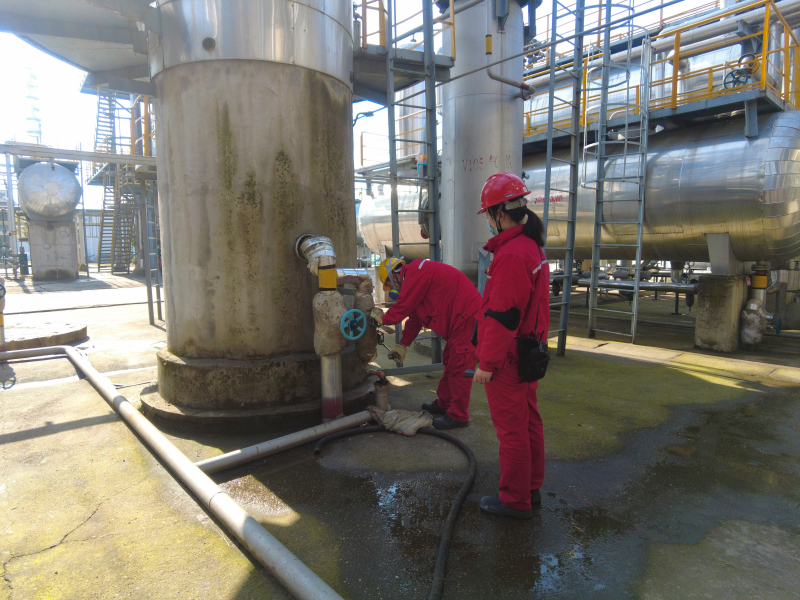 硫磺车间设备管理员肖江晔在老硫磺脱臭剂泵西侧明沟处,配合维修车间人员对潜水泵进行检修,防止明沟污水泄漏。