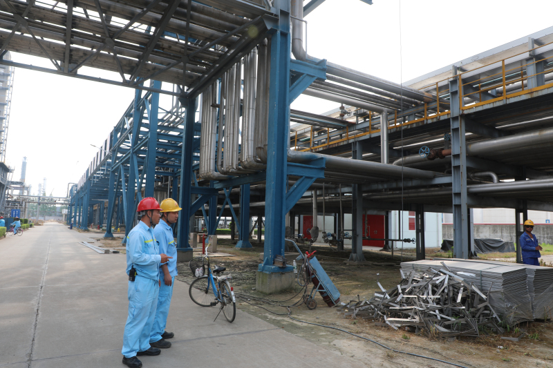 公司党委委员、安全环保处副处长李仁彪在12#管廊检查减一和减二线管道管托、伴热管焊接作业安全措施落实情况。