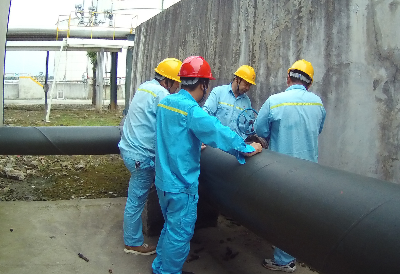 物流公司副总经理谢胜良组织油库当班员工更换库区消防水池根部阀门,确保消防设施完好。