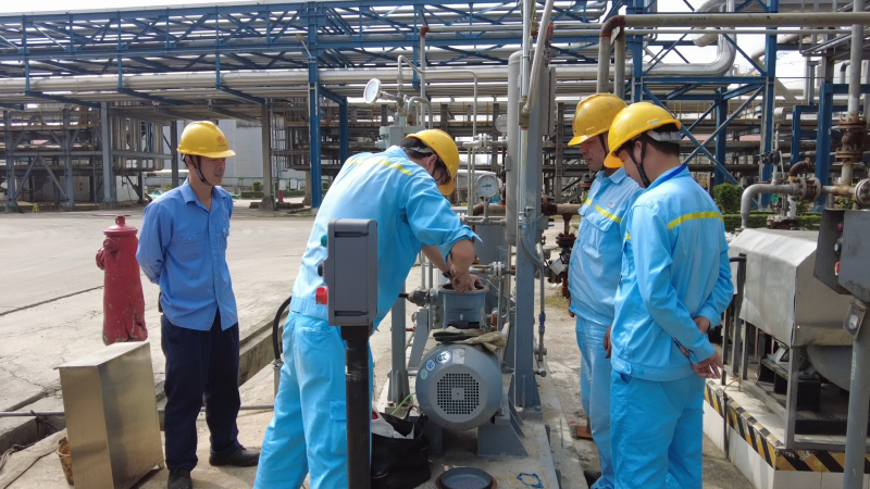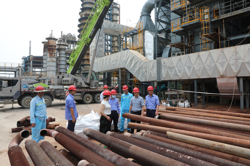 海润党支部委员、副总经理朱斌,改质车间主操杨凯对检修现场材料切割作业进行安全监护。