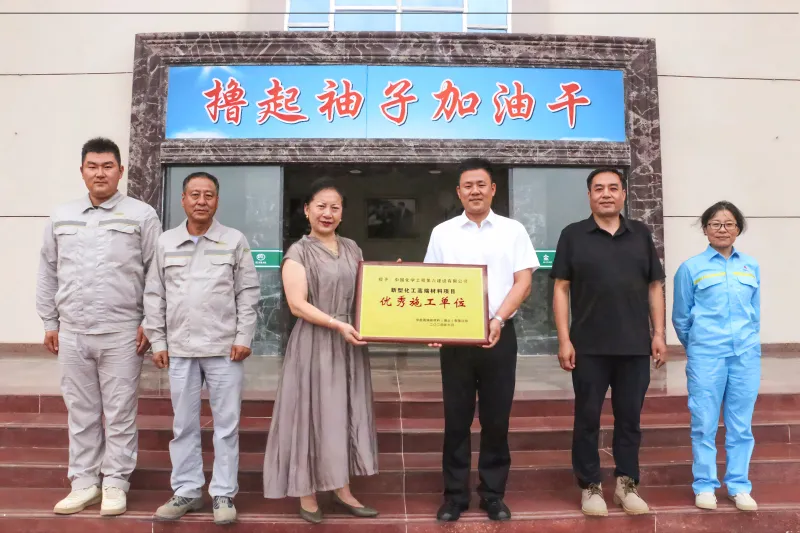 7月11日,金澳科技副总裁舒方和副总裁、项目经理白丹江代表中能高端新材料(湖北)有限公司,为中国化学工程第六建设有限公司颁发“优秀施工单位”荣誉奖牌,中化六建武汉分公司总经理江厚林率其团队接受了这一殊荣。
