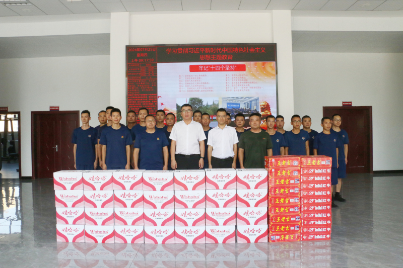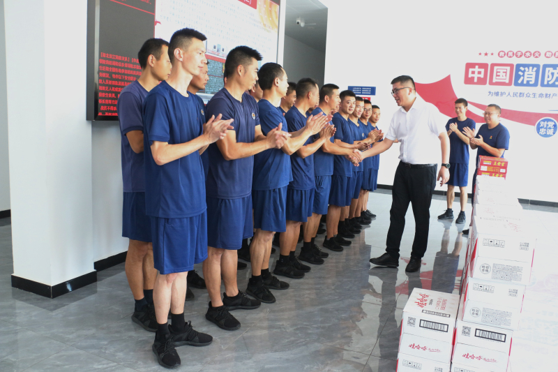 7月25日,在“八一”建军节即将到来之际,金澳科技副总裁吴时斌、杨巍一行带着满载着关心的防暑饮料,来到潜江市消防救援大队,向消防官兵们致以崇高的敬意和诚挚的慰问。