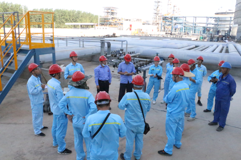 金澳科技党委书记、轮值总裁肖生强,副总裁杨巍,党委委员、总裁助理刘应龙及各专业组人员,对新建5万方原油罐进行投运前现场检查及验收交接工作。